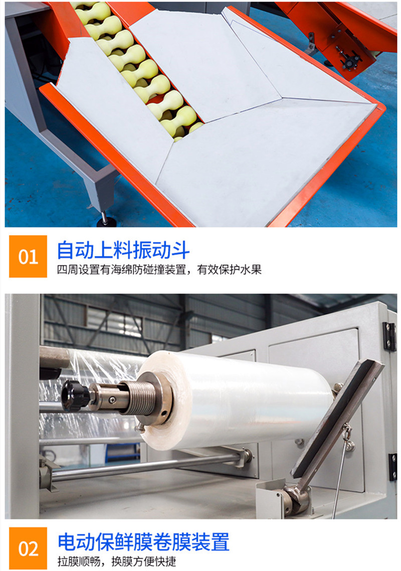 全自動水果保鮮膜包裝(zhuāng)機;適(shì)用於單(dān)果包裝,包裝(zhuāng)速度快,並且能有效保護水果不(bú)受損傷,省人工,提升效率;操作簡便,更換拉膜裝(zhuāng)置簡單,智能溫控切刀(dāo),有效防止漏包,高感度光電眼色標跟蹤,使(shǐ)封切位置更加準確;運行轉動係統簡潔,工作更可靠,維護(hù)保養更方便。