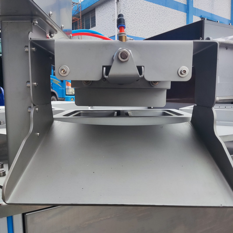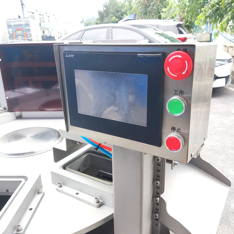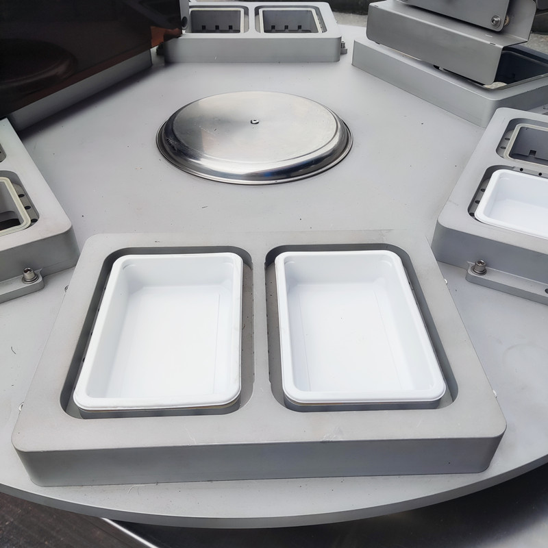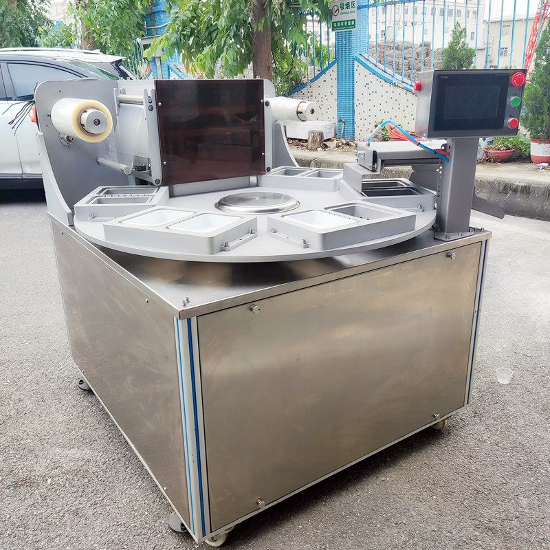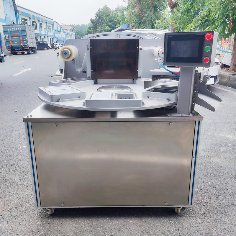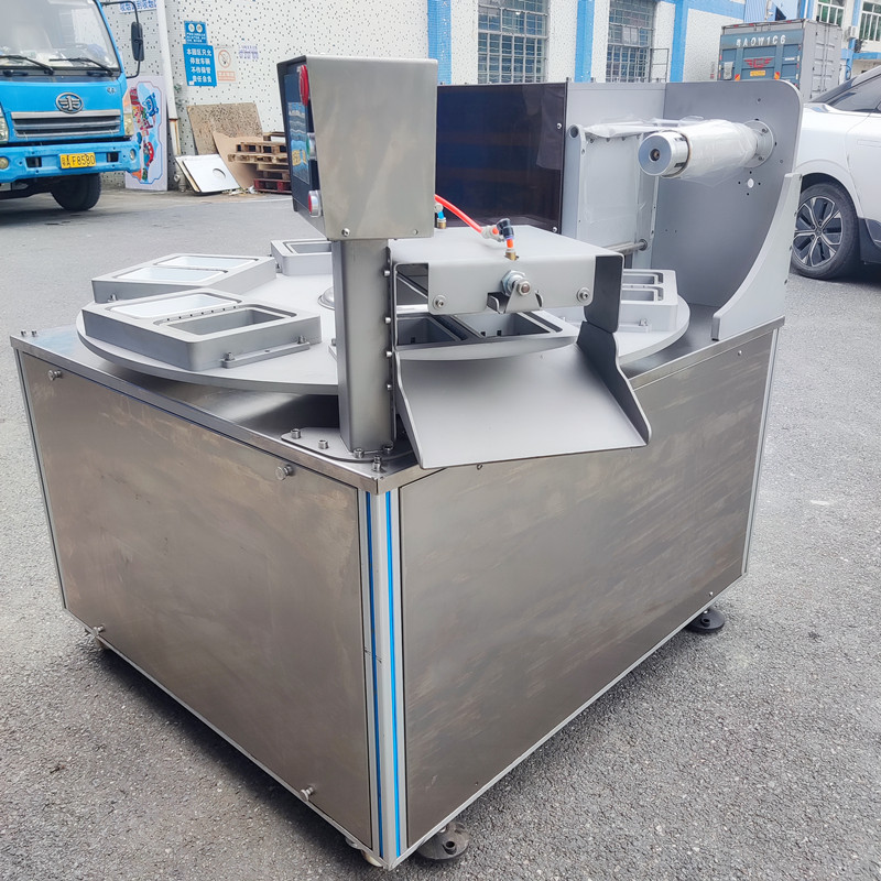 機器為旋轉式,在旋轉盤上分布6個工(gōng)位,每(měi)個工位有1-2個模具,其中兩個工位用於擺放托盒,一個工位用於產品盒(hé)檢(jiǎn)測,一個工位用於產品封口包裝,一個工位(wèi)用於(yú)推出物料(liào),剩下一個工(gōng)位屬(shǔ)於(yú)安全預留位置。工(gōng)作時先將產品(pǐn)放(fàng)在托盒裏,再將托盒(hé)放(fàng)入設備的放料區(qū)模具內,托盒隨(suí)著(模具)轉盤的轉動運行進入(rù)到封口模具裏,封口模模具下降,在封口模具(jù)裏(lǐ)將上膜附在托盒上,先抽真空(或氣(qì)調)再封口、(上膜和托盒封在一起)衝切。包裝好的產品隨著轉盤轉動繼續向前運行,從出料(liào)口用氣缸托起托盒,撥杆推出托盒,完成產品(pǐn)包裝。